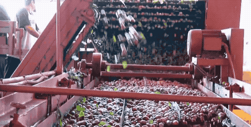 接着倒入清洗系统,在清洗果实的过程中,靠树叶和果实本身密度不同,用浮力去分离掉叶子。