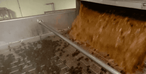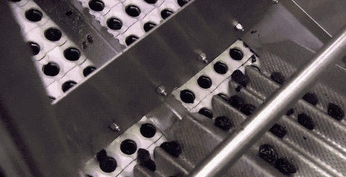 紧接着的传送带上,布有许多小孔,孔径则是由小逐渐变大,把西梅干按照大小进行分级,掉入下面相连的桶里进行收集。小的会加入麦片等,而大的西梅干就会成为我们的零食。