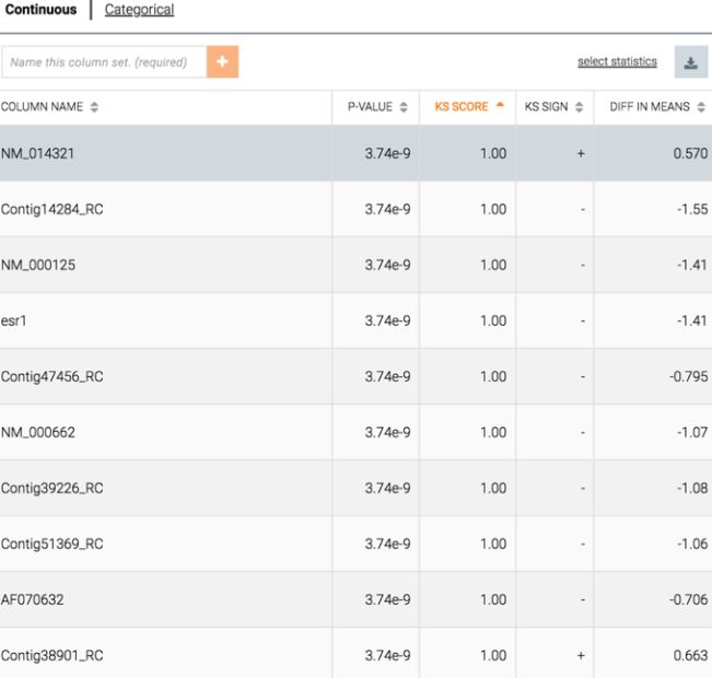 如果选择其中的两个子组,Ayasdi 技术允许研究者根据他们的 Kolmogorov-Smirnov 分数(KS 分数)生成特征列表。每个特征有两个分布——每个子组各有一个分布。KS 分数衡量两个子组之间的差异。与本结构相关的也就是标准统计意义上的 P 值。