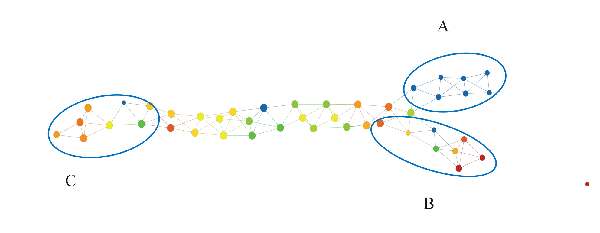 我们也可以看到,C 组似乎是 B 组的一个「较弱」形式,其中右上角的蓝色区域面积较小,下面区域的红色较弱。在左侧的「岛」上,C 组也显示出比 A 、B 组更强的红色着色。理解哪些基因参与了 A、B、C 三组右上角的强红色块将是非常有意思的。此外,研究哪些基因参与了左侧「岛」的表达也很有趣。了解这些基因组需要使用各种基于网络的生物学通路分析的工具。
