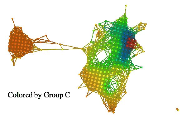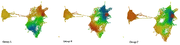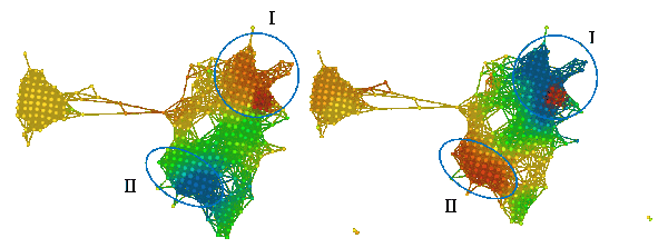 组 I 和组 II 的颜色明显不同。组 I 在 A 组中主要为红色,而在 B 组中主要为蓝色(小固相区域除外)。组 II 恰好相反,在 A 组中为蓝色,在 B 组中为红色。这些组可能与高雌激素受体表达有关,其中在组 I 中呈正相关,在组 II 中呈负相关。众所周知,雌激素受体表达是乳腺癌存活与否的「强信号」。如果我们比较所有三组(如下图):