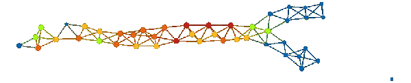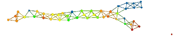 上图表明,拓扑模型包括一个很长的「树干」部分,然后分裂成两个「小枝」。在数据集中,存在一个名为 eventdeath 的二进制变量。如果患者在研究期间存活,则 eventdeath = 0;如果患者死亡则 eventdeath = 1。令人感兴趣的是,患者存活情况与图的结构相对应。一种方法是通过变量 eventdeath 的平均值进行着色。其结果如下所示。