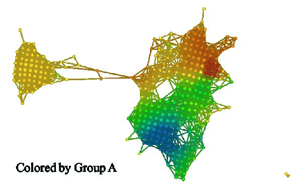 我们将把它记为 fi,G。当这个数字包含 i 时,我们在 M^T 的行集合上获得一个函数。因此,再次重申,M 矩阵中的行的一个子组将在 M^T 的行集合上产生一个函数。Ayasdi 拓扑模型的功能之一是,通过对应于节点的行,能够利用数据矩阵的行函数的平均值对拓扑模型的节点进行着色。这对于了解数据属性而言是一个非常有用的方法。尤其地,我们现在可以利用 M^T 矩阵的行集合中子组 G 的着色情况,查看该组的特征。