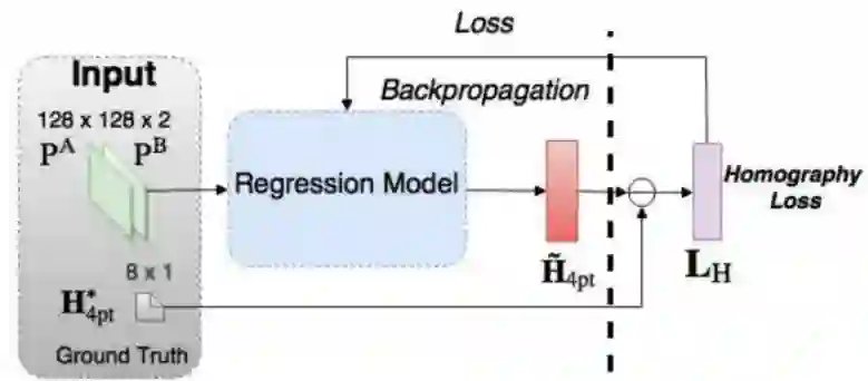 这个网络产生了 8 个实数作为输出。它是以有监督的方式进行训练的,以输出和真实的单应之间的欧氏距离作为损失函数。