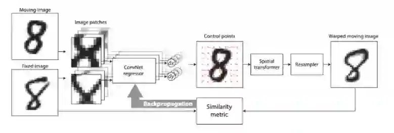 他们保持了原来的 CNN,但是使用了新的、适应于无监督方法的损失函数:他们选择了不需要真实标签的光度损失(photometric loss)。此外,它还计算了参考图像和待配准变换图像之间的相似度。
