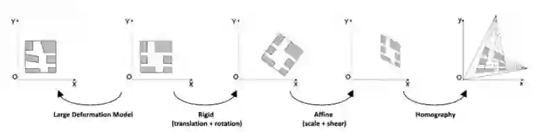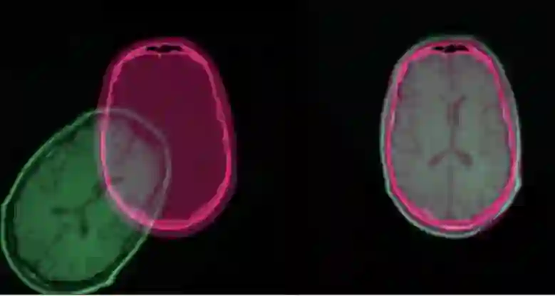 目前有很大一部分关于图像配准的研究关注于医疗图像领域。通常,由于受试者的局部形变(如呼吸变化、解剖学变化等),两幅医疗图像之间的变换不能简单地通过单应矩阵来描述。所以需要更复杂的变换模型,例如可以用位移矢量场表示的微分同胚。