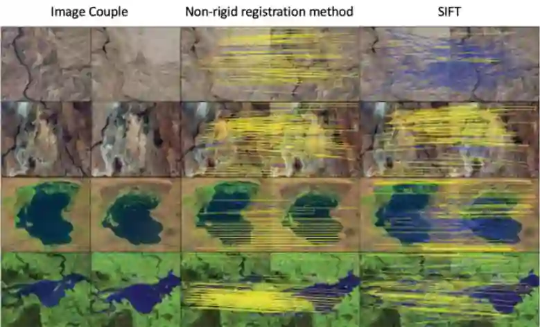 2018 年,Yang 等人基于同样的思想研发了一种非刚性配准方法「Multi-temporal Remote Sensing Image Registration Using Deep Convolutional Features」(https://ieeexplore.ieee.org/document/8404075)。他们使用预训练的 VGG 网络层来生成能够同时保持卷积信息和定位能力的特征描述子。这些描述子似乎也要优于和 SIFT 类的描述子,尤其是在 SIFT 包含很多轮廓或者不能匹配到足够数目的特征点的情况下。