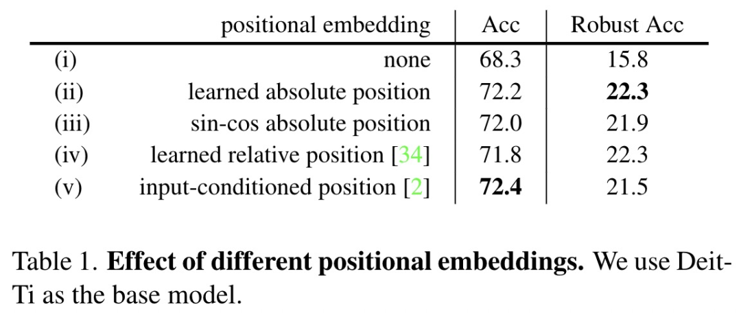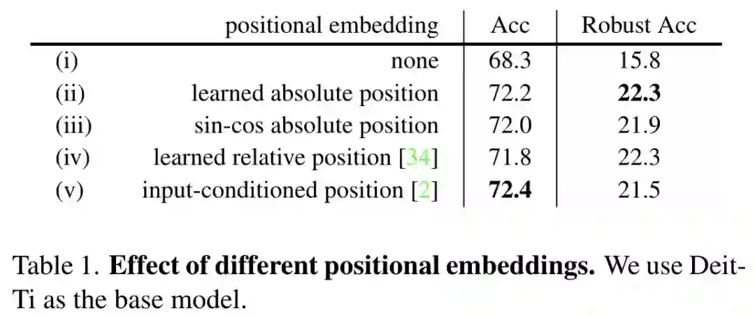 研究者采用 DeiT-T 作为基准模型,采用 ImageNet 验证集和 FGSM 攻击算法下的准确率分别作为正常以及鲁棒识别能力指标。下表 1 给出了不同位置嵌入的影响,