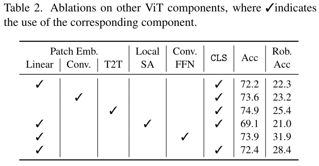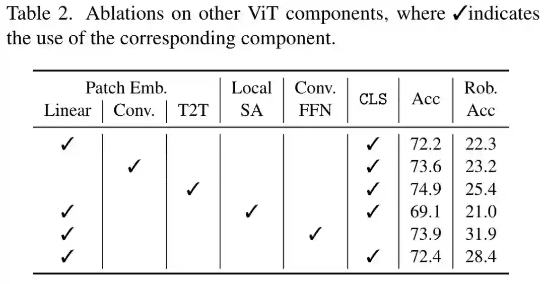 下表 2 分别展示了图像块特征提取方式、自注意力范围、以及不同前馈层和分类层形式的影响。实验经验性地发现使用卷积提取图像块特征,并采用全局自注意力和用于分类的 CLS token,通常使得 ViT 具备更好的鲁棒性。