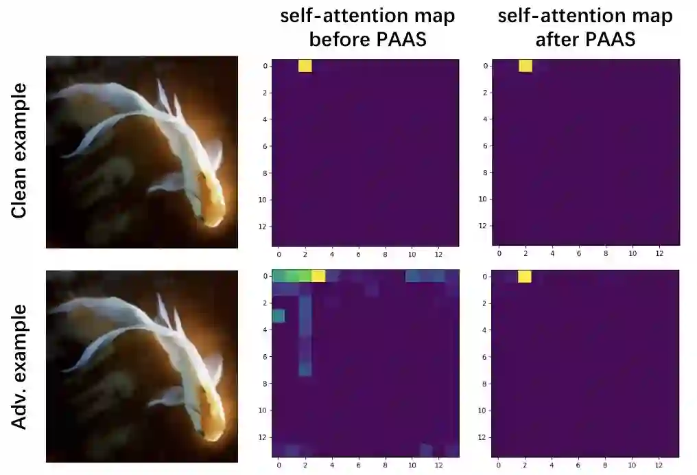 如下图所示,在对抗样本输入下,ViT 的自注意力图出现噪声并激活一些不相关区域,使用位置相关的自注意力缩放后,该噪声被有效抑制,并只有对分类有帮助的相关位置被激活,间接提升了鲁棒性。