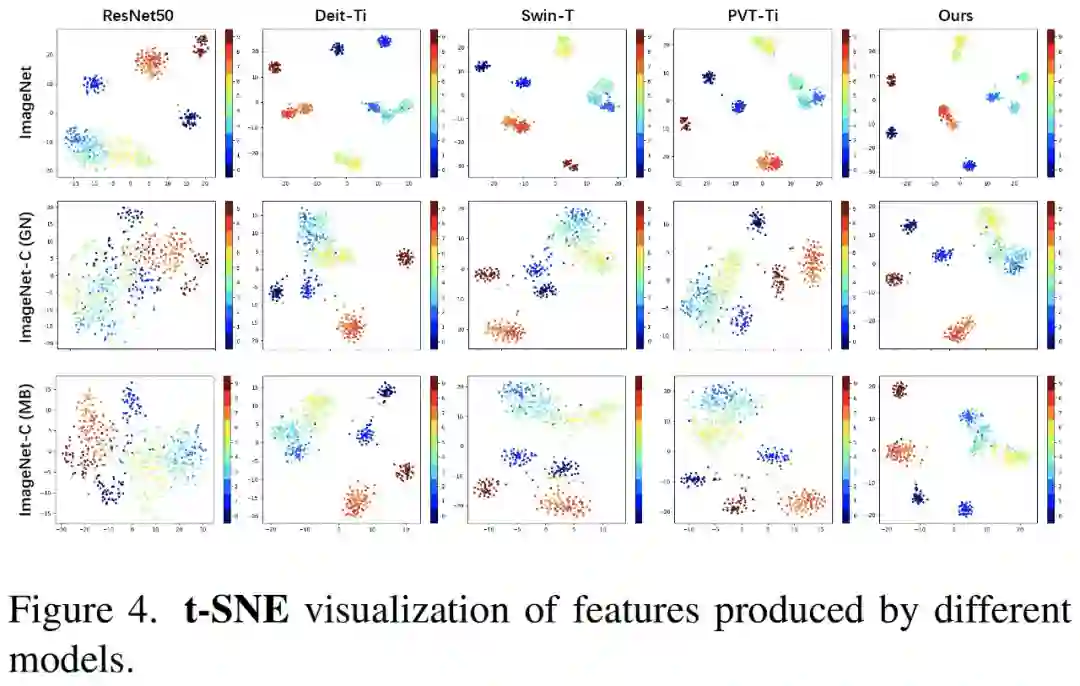 研究者还采用 t-SNE 技术对 RVT 模型提取特征进行降维及可视化,由下图 4 可看出,在正常分类样本和噪声样本上,RVT-S 的特征均更加紧凑,类内样本点靠近类簇,类间样本相距较远。该形态使得表征更具判别性,更难以被攻破。