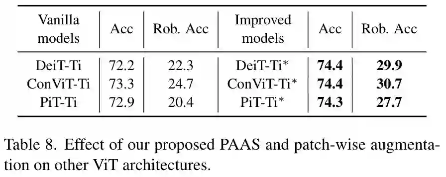 与 MixUp、AugMix、RandAugment 类似,基于数据块的数据增强也有助于 ViT 模型的鲁棒性。通过对单个图像块做简单随机变换,等同于在图像块嵌入上添加有意义的干扰,在该干扰下的训练有助于模型抵抗未知干扰,进而提升对抗攻击下的识别率。