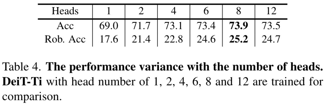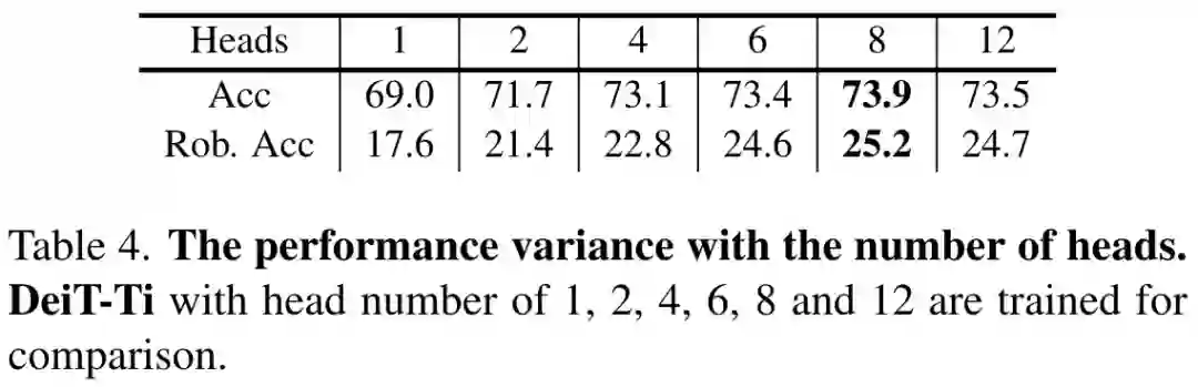 自注意力通常采用多头的形式以增强表征能力。由下表 4 看出,多头注意力同时也增强了鲁棒性,但当注意力头持续增加至冗余,模型表现不升反降,因此为选择 ViT 选择合适的注意力头数是至关重要的。