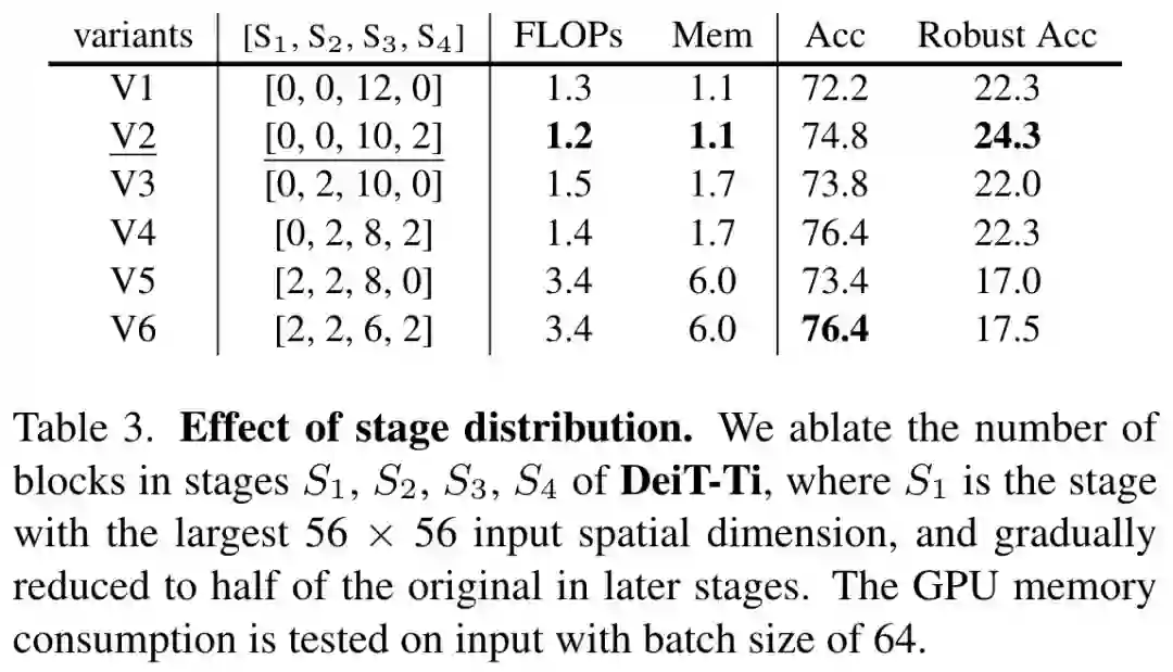 下表 3 研究了当 ViT 采用类似 CNN 中阶段性下采样的设计,是否会影响鲁棒性。当自注意力在大尺寸特征图上计算时,会引起计算量显著增加,并大幅损害模型鲁棒性,反之大尺度的自注意力层具备更好的鲁棒性。