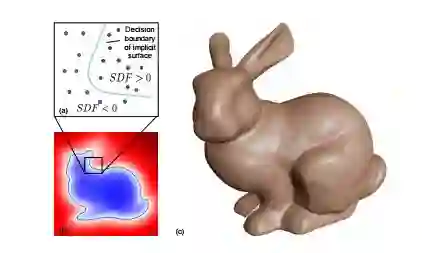 图 2:本研究提出的 DeepSDF 表征应用于 Stanford Bunny:(a) 隐式表面 SDF = 0,SDF < 0 表示表面内的采样点,SDF > 0 表示表面外的采样点;(b) SDF 的 2D 交叉区域;(c) 从 SDF=0 恢复的渲染后的 3D 表面。注意 b 和 c 都是通过 DeepSDF 恢复的。