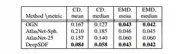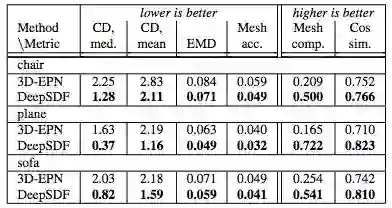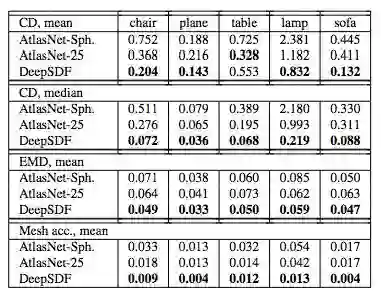 表 3:在编码未知形状时,DeepSDF 在大量形状类别和指标上显著优于 AtlasNet。
