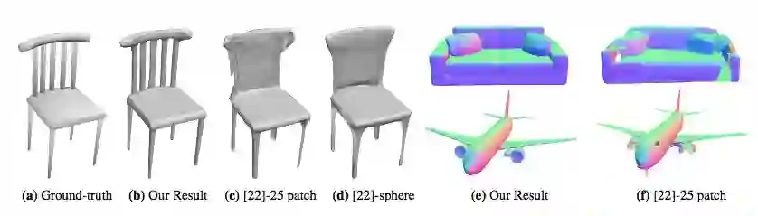 图 6:DeepSDF 和 AtlasNet [22] 之间的重建结果对比。注意,AtlasNet 无法捕捉椅子的精细细节,从 (f) 中可以看到沙发和飞机上的洞。