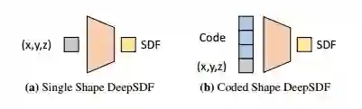 图 3:在单个形状的 DeepSDF 实例化中,形状信息包含在网络中;而在编码形状的 DeepSDF 中,形状信息包含在编码向量中,并和 3D 样本位置拼接。在两种案例中,DeepSDF 都能生成 3D 查询位置的 SDF 值。