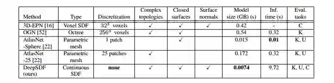 表 1:benchmark 方法纵览。AtlasNet-Sphere 只能描述拓扑球体,体素/八叉树类方法(也就是 OGN)只能提供 8 个方向法线,AtlasNet 不能提供定向法线。我们的任务评估:k 表示已知形状,U 表示未知形状,C 表示形状完备。
