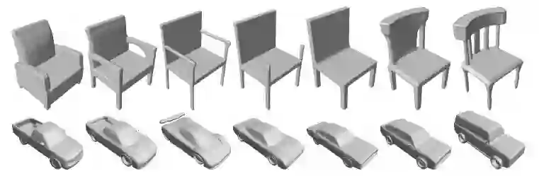 图 1:DeepSDF 通过潜在编码和前馈解码器网络来表征形状的符号距离函数。以上图像是 DeepSDF 在学习到的形状潜在空间中进行两个形状的插值后的光线投射渲染。
