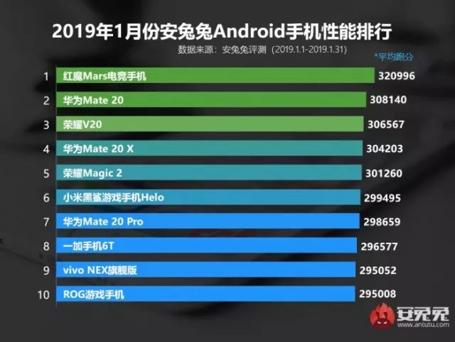 2月1日,安兔兔根据后台统计的数据,公布了2019年1月份国内Android手机性能榜单。本月红魔Mars电竞手机继续位列第一名,平均成绩为320996,和上月基本持平。排名2-5位的则是搭载麒麟980处理器的四兄弟,依次是Mate 20、荣耀V20、Mate 20 X以及荣耀Magic 2,四者的平均成绩都在30-31万之间。但遗憾的是,Mate 20 Pro的平均成绩居然低于30万,而且被黑鲨游戏手机Helo反超,位居第七名。8-10名依次是一加手机6T、vivo NEX旗舰版以及ROG游戏手机,平均成绩也都超过了29.5万。