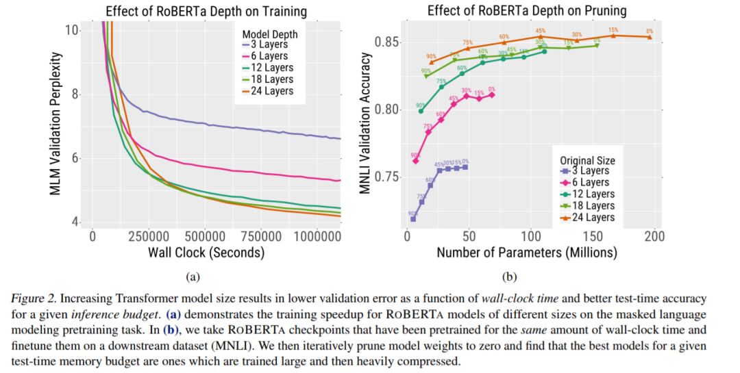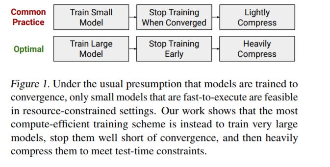 这导致大型Transformer 模型的训练效率与小型Transformer 模型的推理效率之间存在明显的权衡。然而,我们证明大型模型比小型模型对量化和剪枝等压缩技术有更强的鲁棒性。因此,我们可以同时利用两个方面的优势:高度压缩的大型模型比轻度压缩的小型模型获得更高的精度。