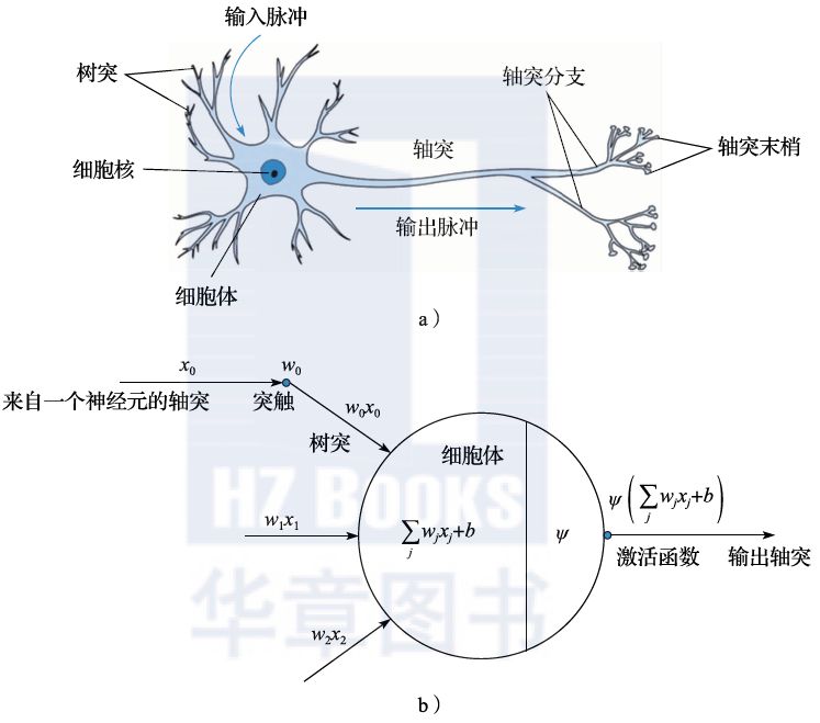 神经网络是一类典型的非线性模型,它的设计受到生物神经网络的启发。人们通过对大脑生物机理的研究,发现其基本单元是神经元,每个神经元通过树突从上游的神经元那里获取输入信号,经过自身的加工处理后,再通过轴突将输出信号传递给下游的神经元。当神经元的输入信号总和达到一定强度时,就会激活一个输出信号,否则就没有输出信号(如图2.7a所示)。