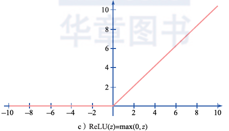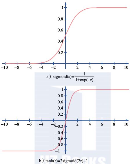 但是,由于阶跃函数本身不连续,对于机器学习而言不是一个好的选择,因此在人们设计人工神经网络的时候通常采用连续的激活函数,比如Sigmoid函数、双曲正切函数(tanh)、校正线性单元(ReLU)等。它们的数学形式和函数形状分别如图2.8所示。