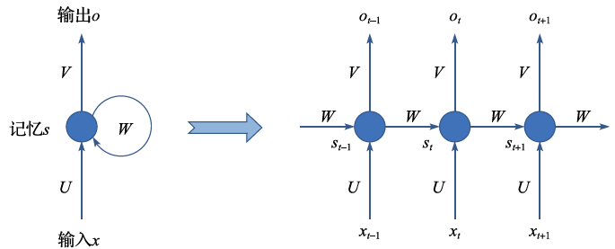 循环神经网络(Recurrent Neural Network,RNN)[14]的设计也有很强的仿生学基础。我们可以联想一下自己如何读书看报。当我们阅读一个句子时,不会单纯地理解当前看到的那个字本身,相反我们之前读到的文字会在脑海里形成记忆,而这些记忆会帮助我们更好地理解当前看到的文字。这个过程是递归的,我们在看下一个文字时,当前文字和历史记忆又会共同成为我们新的记忆,并对我们理解下一个文字提供帮助。其实,循环神经网络的设计基本就是依照这个思想。我们用表示在