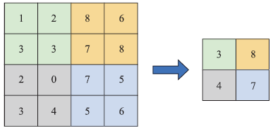 除了卷积以外,池化也是卷积神经网络的重要组成部分。池化的目的是对原特征映射进行压缩,从而更好地体现图像识别的平移不变性,并且有效扩大后续卷积操作的感受野。池化与卷积不同,一般不是参数化的模块,而是用确定性的方法求出局部区域内的平均值、中位数,或最大值、最小值(近年来,也有一些学者开始研究参数化的池化算子[39])。图2.11描述了对图像局部进行2×2的最大值池化操作后的效果。