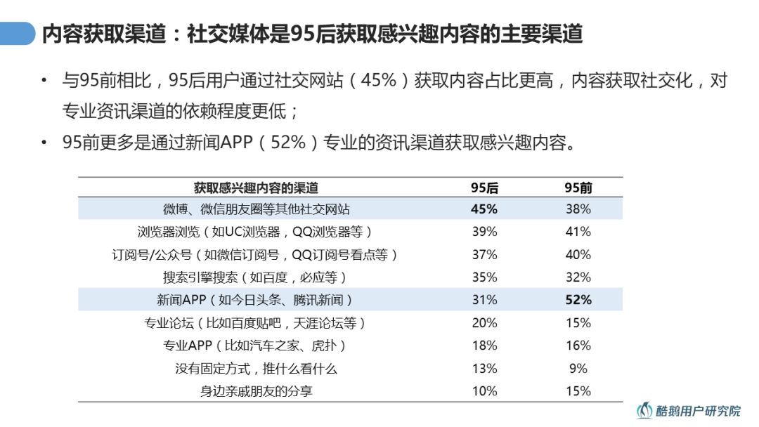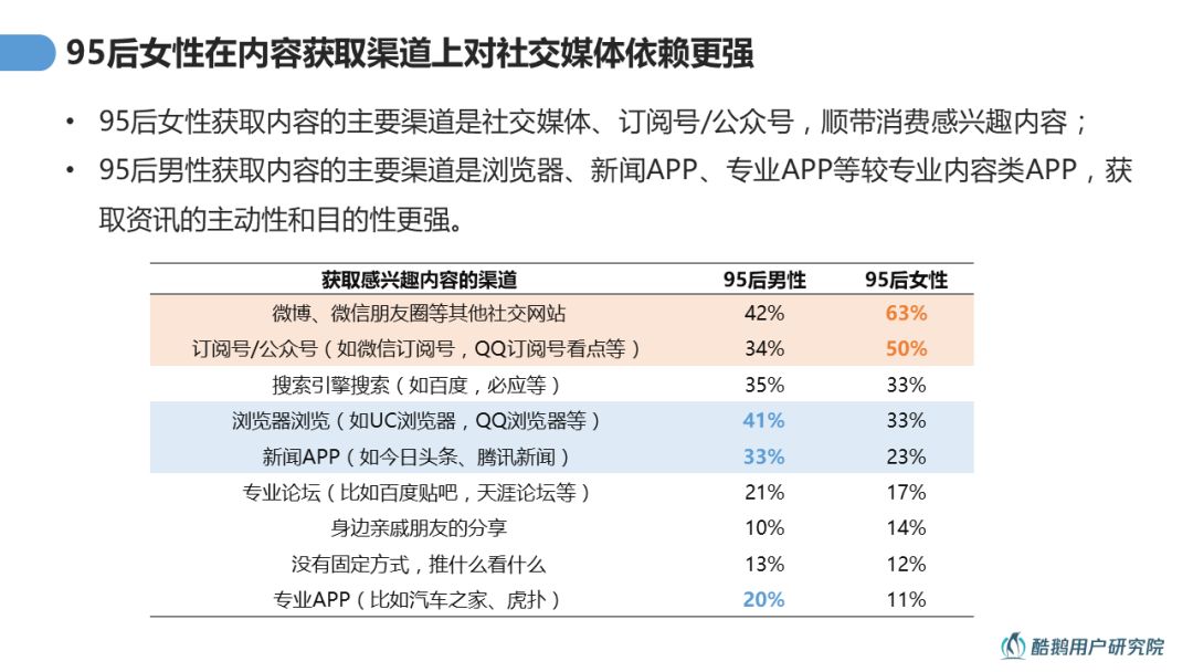 95后用户每天使用的APP中最高频的是社交类应用,社交媒体是95后获取感兴趣内容的主要渠道,内容获取社交化,社交传播的影响对于95后用户下载新的APP起关键作用。