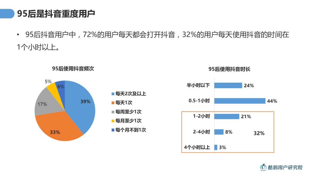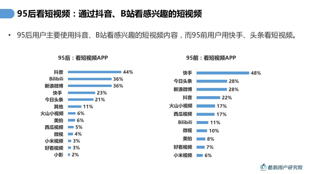 2017年以来,短视频成互联网新风口,95后尝鲜一族也是短视频产品的重度用户,95后用户主要使用抖音、B站去看感兴趣的短视频。