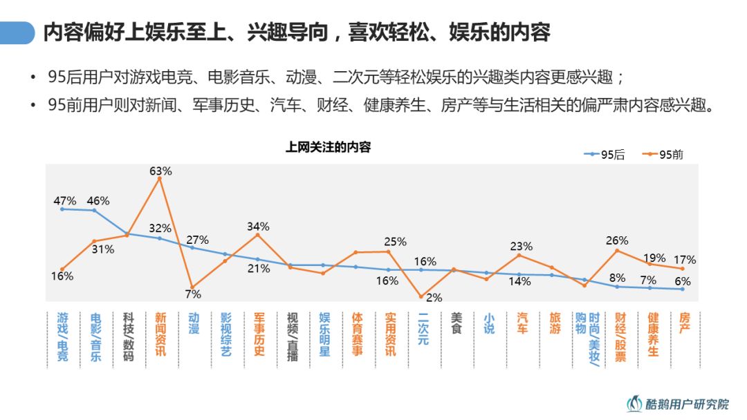 崇尚“宅”文化的95后,宅在家里打游戏、看视频、睡觉是他们普遍的放松与娱乐方式。在内容追求上以“娱乐至上”“兴趣导向”为宗旨,对于正经严肃的内容95后并不买单。