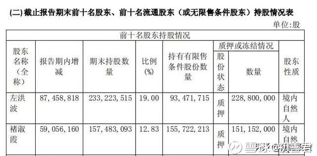 查询上一年的年报可以看到;2017年年报我们发现,公司实控人为左洪波、褚淑霞女士,两人持有的股份几乎都用于质押,质押比例过高,已经接近100%。