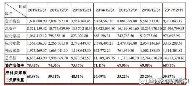 可以看到格力电器的高资产负债率主要是因为应付类科目占据了总负债的大部分余额。在 2011—2017 年经营性流动负债的占比很高,所以说一家在经营活动中获取很多现金流的企业跟大幅缺乏现金流的企业一样,资产负债率都很高。区别在于有超强获取现金流能力的企业在负债端更多的是经营性流动负债,大幅缺乏现金流的企业在负债端更多的是银行的借款和有息债务。