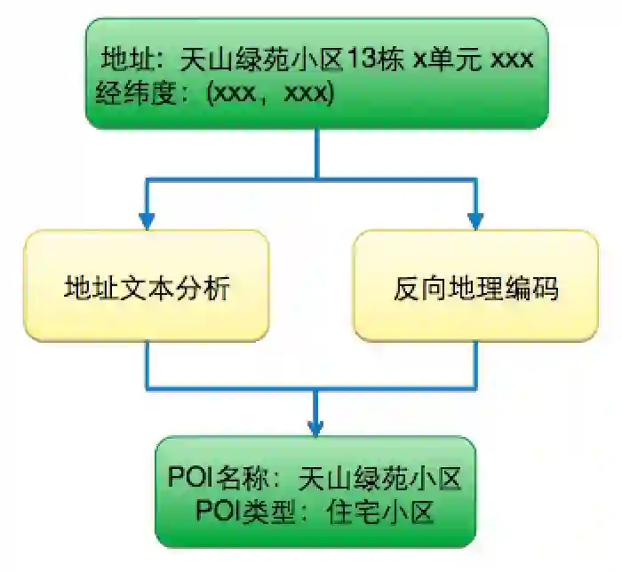 上图是我们订单地址分析的流程。根据订单系统中的用户订单地址文本,基于自然语言处理技术对地址文本分析,可以得到地址的主干名称(指去掉了楼宇、门牌号的地址主干部分)和地址的类型(写字楼、住宅小区等)。在此基础上通过一些地图数据辅助从而判断出最终的地址类型。