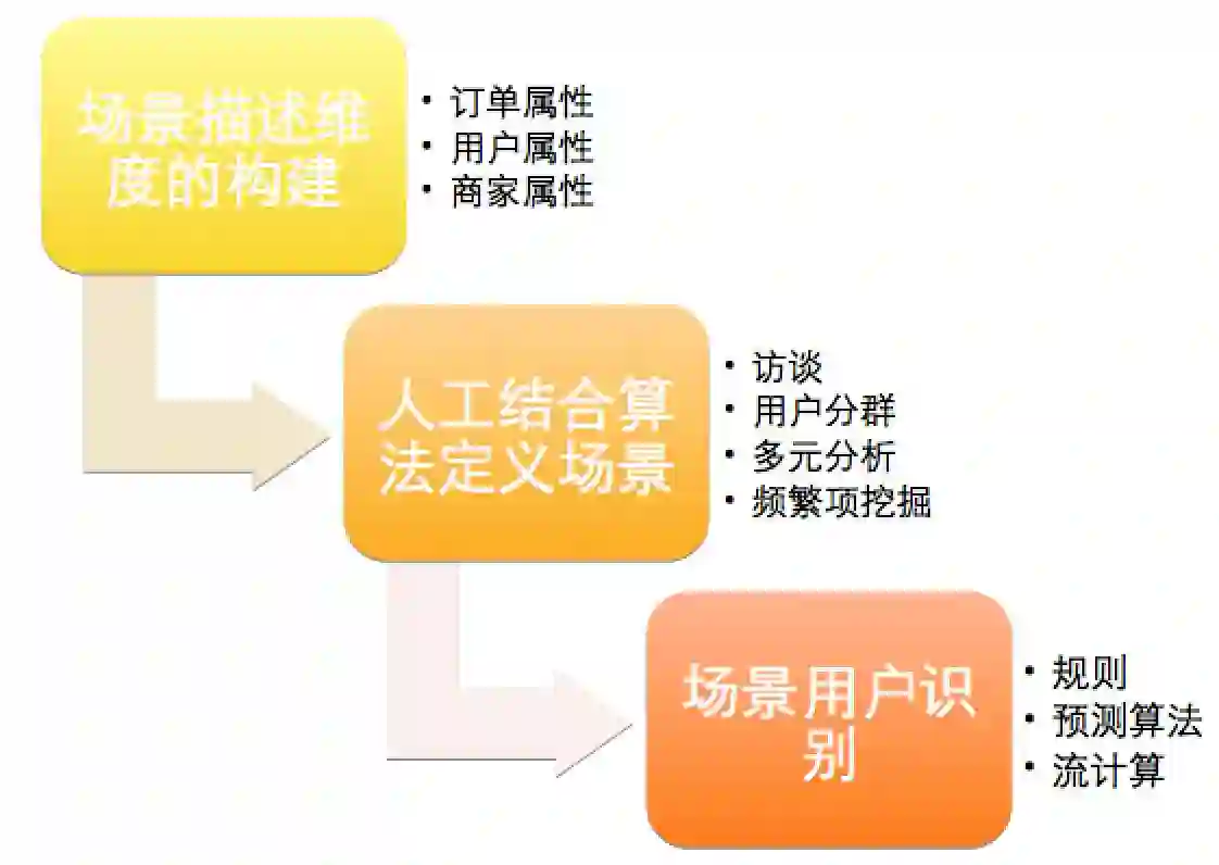 拓展用户的体验,最重要的一点是要理解用户下单的场景。了解用户的订餐场景有助于基于场景的用户运营。对于场景运营而言,通常需要经过如下三个步骤: