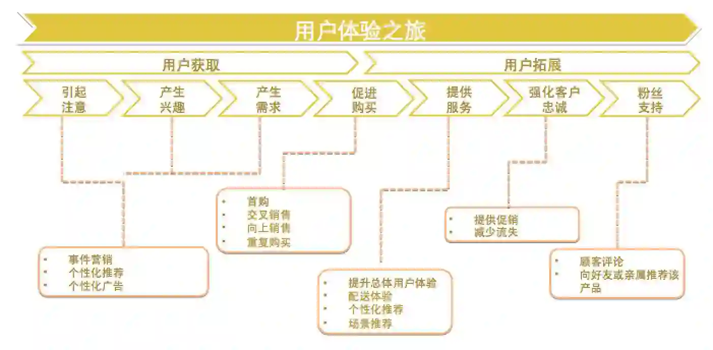如下图所示,我们大致可以把一个产品的运营分为用户获取和用户拓展两个阶段。在用户获取阶段,用户因为自然原因或一些营销事件(例如广告、社交媒体传播)产生对外卖的注意,进而产生了兴趣,并在合适的时机下完成首购,从而成为外卖新客。在这一阶段,运营的重点是提高效率,通过一些个性化的营销和广告手段,吸引到真正有潜在需求的用户,并刺激其转化。在用户完成转化后,接下来的运营重点是拓展用户价值。这里有两个问题:第一是提升用户价值,具体而言就是提升用户的单均价和消费频次,从而提升用户的LTV(life-time value)。基本手段包括交叉销售(新品类的推荐)、向上销售(优质高价供给的推荐)以及重复购买(优惠、红包刺激重复下单以及优质供给的推荐带来下单频次的提升);第二个问题是用户的留存,通过提升用户总体体验以及在用户有流失倾向时通过促销和优惠将用户留在外卖平台。