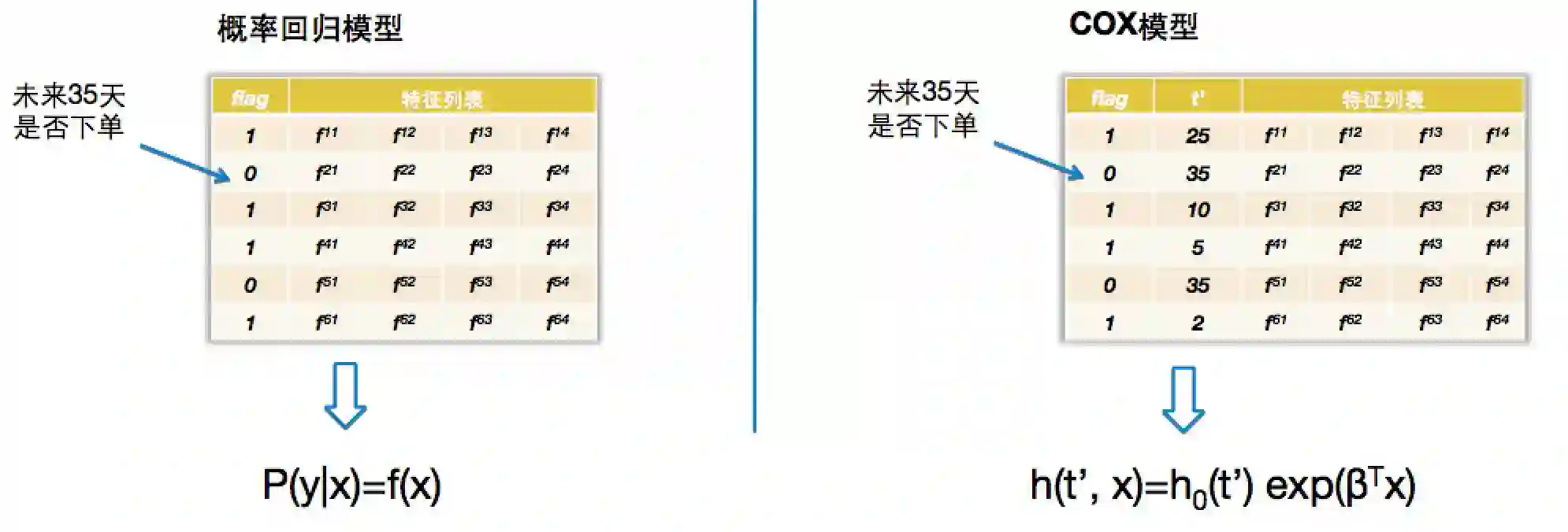 下图左边是概率回归的模型,用户未来T天内是否有下单做为类别标记y,然后估计在观察到特征X的情况下y的后验概率P(y|X)。右边是用COX模型的例子,我们会根据用户在未来T天是否下单给样本一个类别,即观测时长记为T。假设用户的下单的距今时长t<T,将t作为生存时长t';否则将生存时长t'记为T。这样一个样本由三部分构成:样本的类别(flag),生存时长(t')以及特征列表。通过生存模型虽然无法显式得到P(t'|X)的概率,但其协变量部分实际反映了用户流失的风险大小。