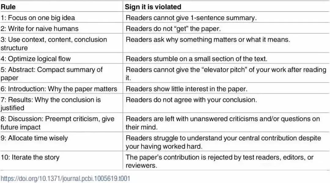 前四条规则可以应用于一篇论文的所有部分,甚至是其他形式的交流,如会谈和海报等。中间四条规则涉及论文每个主要部分的主要目标。最后两条规则为有效构建论文原稿提供了过程启发式的指导。接下来就随我们一起,了解论文写作的奥义。