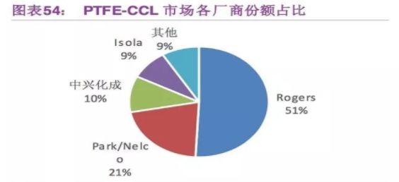 高频基材行业壁垒高,龙头企业优势明显,美日企业占据大部分市场。罗杰斯在PTFE-CCL的市场份额超过50%。国内主要有生益科技。