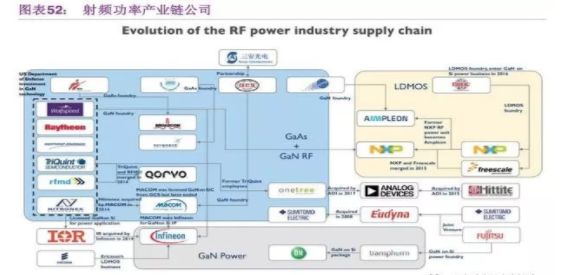 GaN产业链的主要厂商有SumitomoElectric、Wolfspeed、Qorvo、M-A/COM、UMS、NXP、Ampleon、RFHIC、MitsubishiElectric、NorthropGrumman、Anadigics。