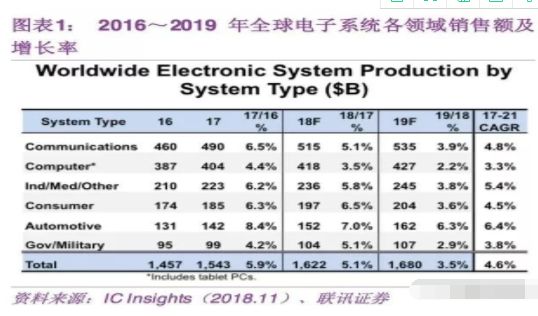 ICInsights预计2018年全球电子产品销售额16220亿美元,同比增长5.1%,2019年将达到16800亿美元,同比增长3.5%,2017~2021年CAGR=4.6%。