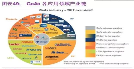 产业链上游为衬底制造,随后是GaAs外延(使用MOCVD、MBE等外延技术)。中游为晶圆加工和封测。下游为手机、基站等应用。住友电工、Freiberger、AXT三家公司占据约95%的GaAs晶圆市场份额。