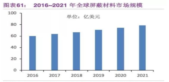 BCCResearch数据显示2013年全球EMI/RFI屏蔽材料市场规模52亿美元,2014年达到54亿美元,2016年达到约60亿美元,预计2021年将达到约78亿美元,2016~2021年CAGR=5.6%。