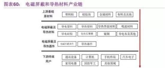 屏蔽材料、导热材料产业链的上游是基础原材料,如:塑料粒、硅胶块、金属材料等。中游是电磁屏蔽及导热材料和器件。下游是各个应用领域的终端客户。