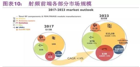 Yole数据显示2017年手机射频前端市场规模150亿美元,预计2023年将达到352亿美元,2017~2023年CAGR=14%。