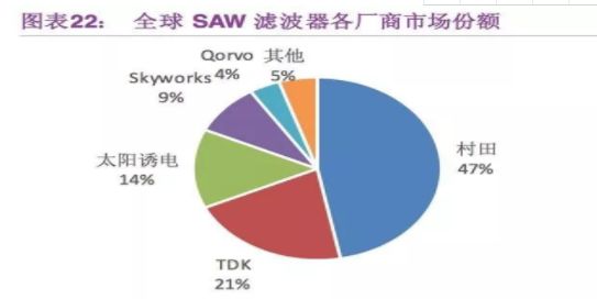 全球SAW滤波器市场份额前五位的厂商分别为村田(47%)、TDK(21%)、太阳诱电(14%)、Skyworks(9%)、Qorvo(4%),合计占比达95%。