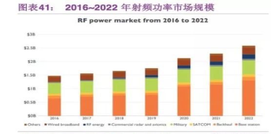 Yole数据显示2016年射频功率半导体(>3W)市场规模接近15亿美元,预计2020年将达到26亿美元,2016~2022年CAGR=9.8%。电信基础设施(包含基站、无线回传)射频功率半导体将占据一半的市场份额。预计2016~2022年基站市场CAGR=12.5%,无线回传市场CAGR=5.3%。
