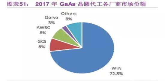 2017年砷化镓晶圆代工市场规模7.3亿美元。台湾稳懋一家独大,占比72.7%。随后是GCS(8.4%)、AWSC(7.9%)。